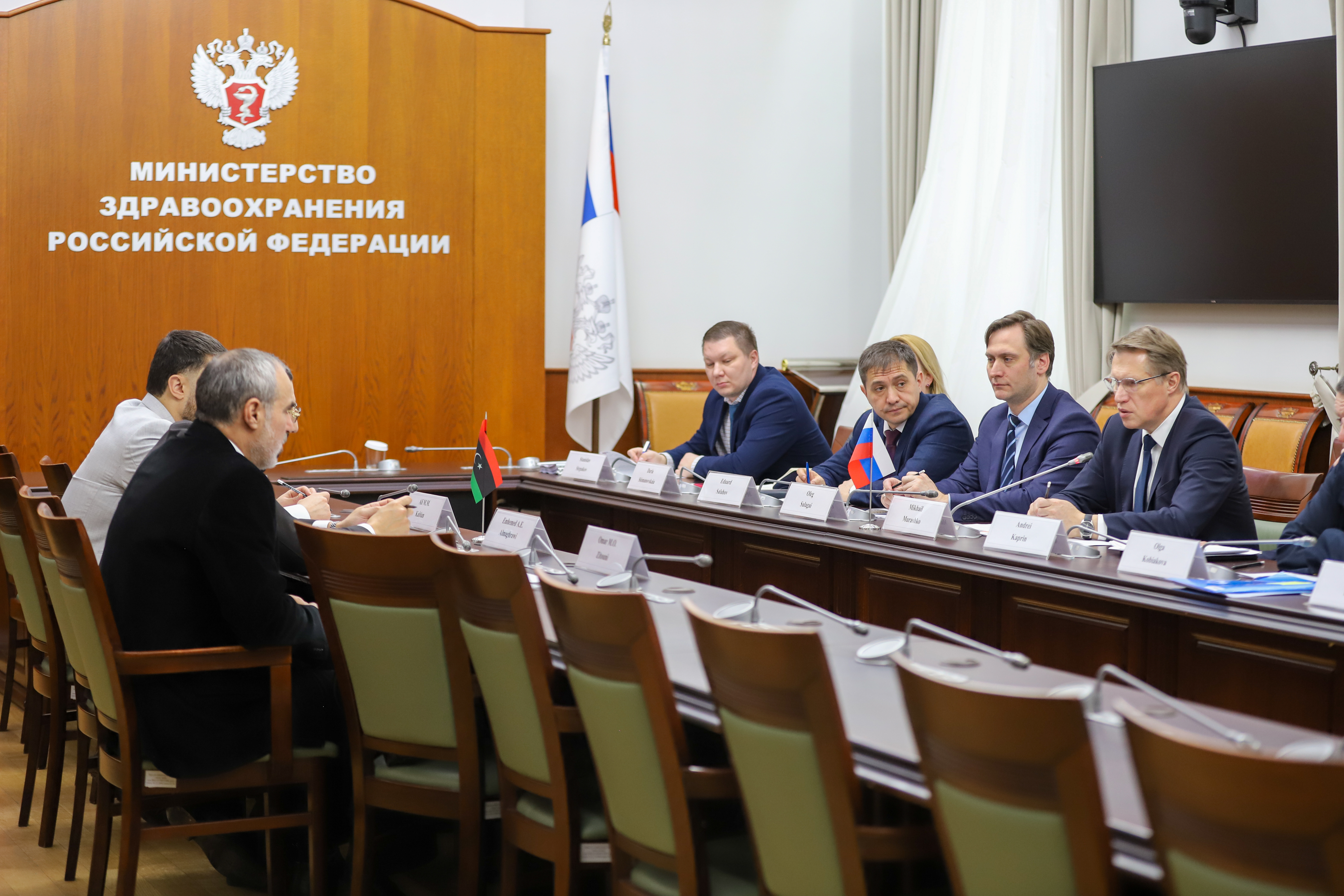 Министр здравоохранения Российской Федерации Михаил Мурашко провел встречу с Чрезвычайным и Полномочным Послом Государства Ливия в Российской Федерации Эмхемедом А.Э. Альмаграви. В ходе встречи стороны обсудили вопросы оказания медицинской помощи гражданам Ливии в России, в частности пациентам с онкологическими заболеваниями, подготовки ливийских медицинских специалистов в российских медицинских вузах, поставки российской медицинской продукции на ливийский рынок и другие приоритетные вопросы двустороннего сотрудничества в области здравоохранения.