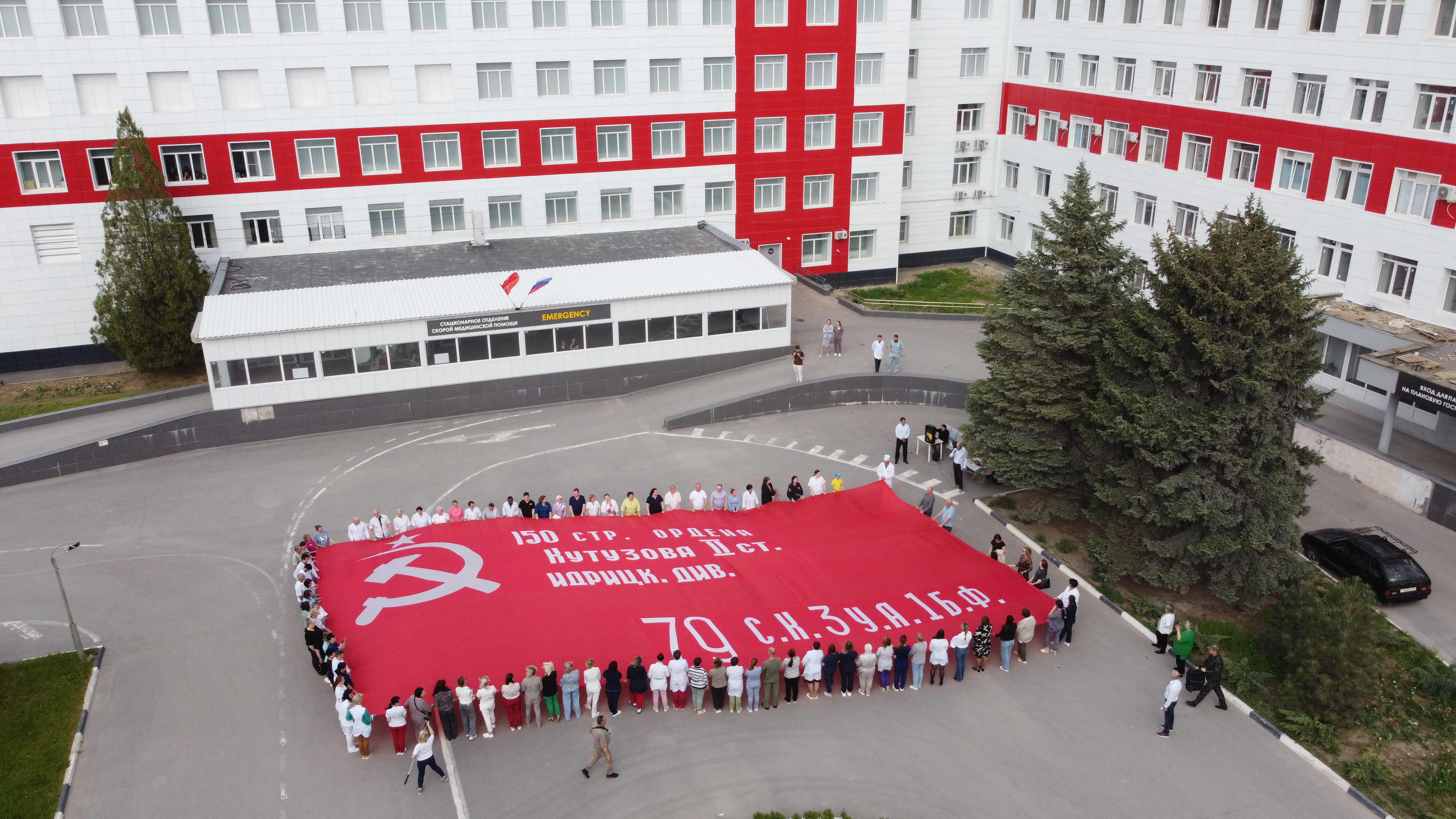 Культовая акция «Знамя Победы», посвящённая Году защитника Отечества и знаменательной дате 80-летия победы в Великой Отечественной войне, приобрела особое значение для коллектива больницы имени Самуила Фишера Волгоградской области. Развёрнутая копия Знамени Победы стала символом уважения и благодарности врачам, медсёстрам и другим сотрудникам учреждения к мужеству и отваге солдат, подаривших мир и свободу нашему народу.