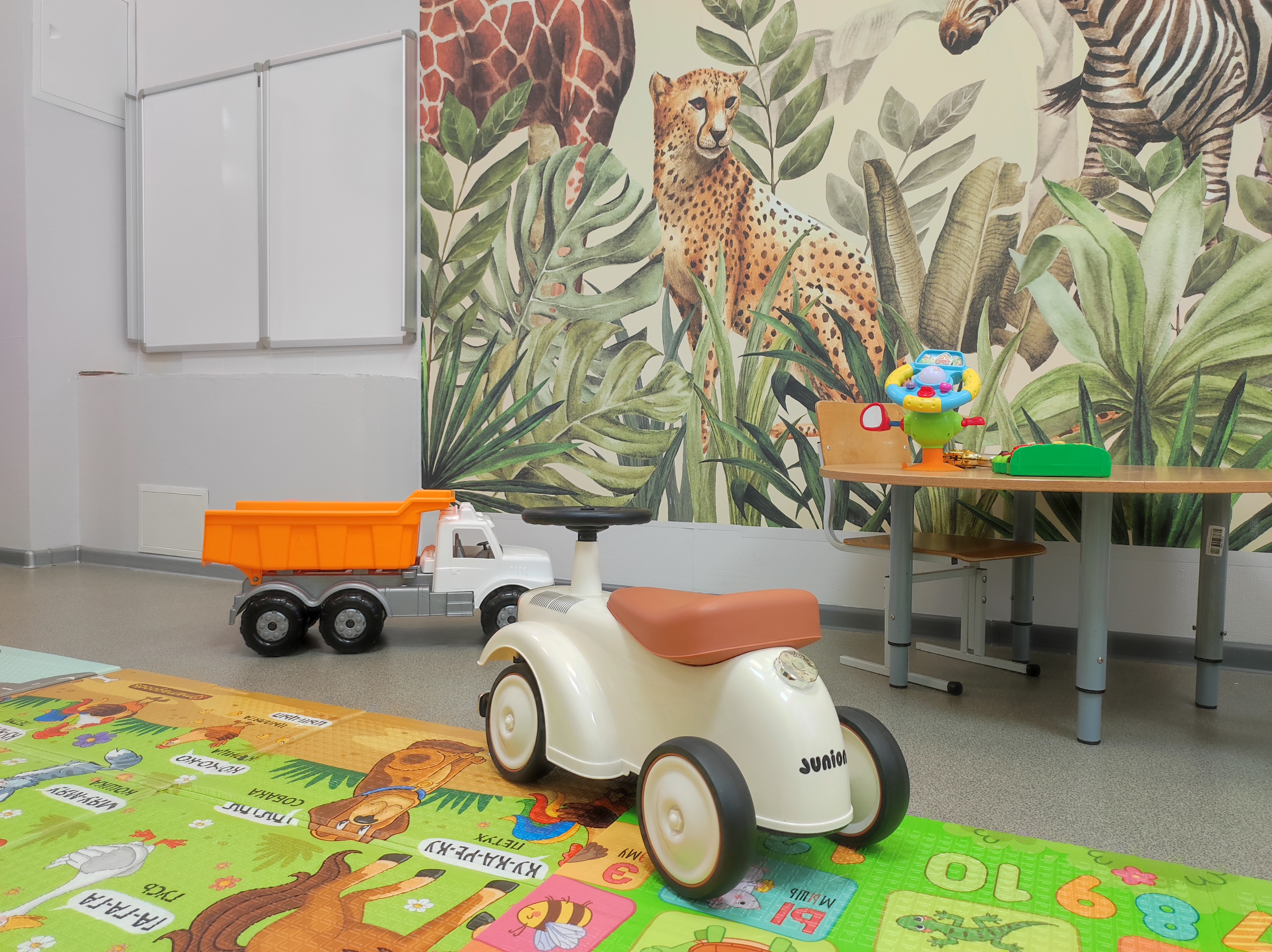 Комната оборудована интерактивными сенсорными панелями и игрушками, обеспечивающими безопасность и возможность легко обеспечить в ней чистоту.